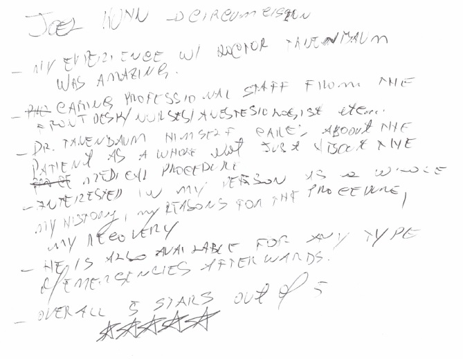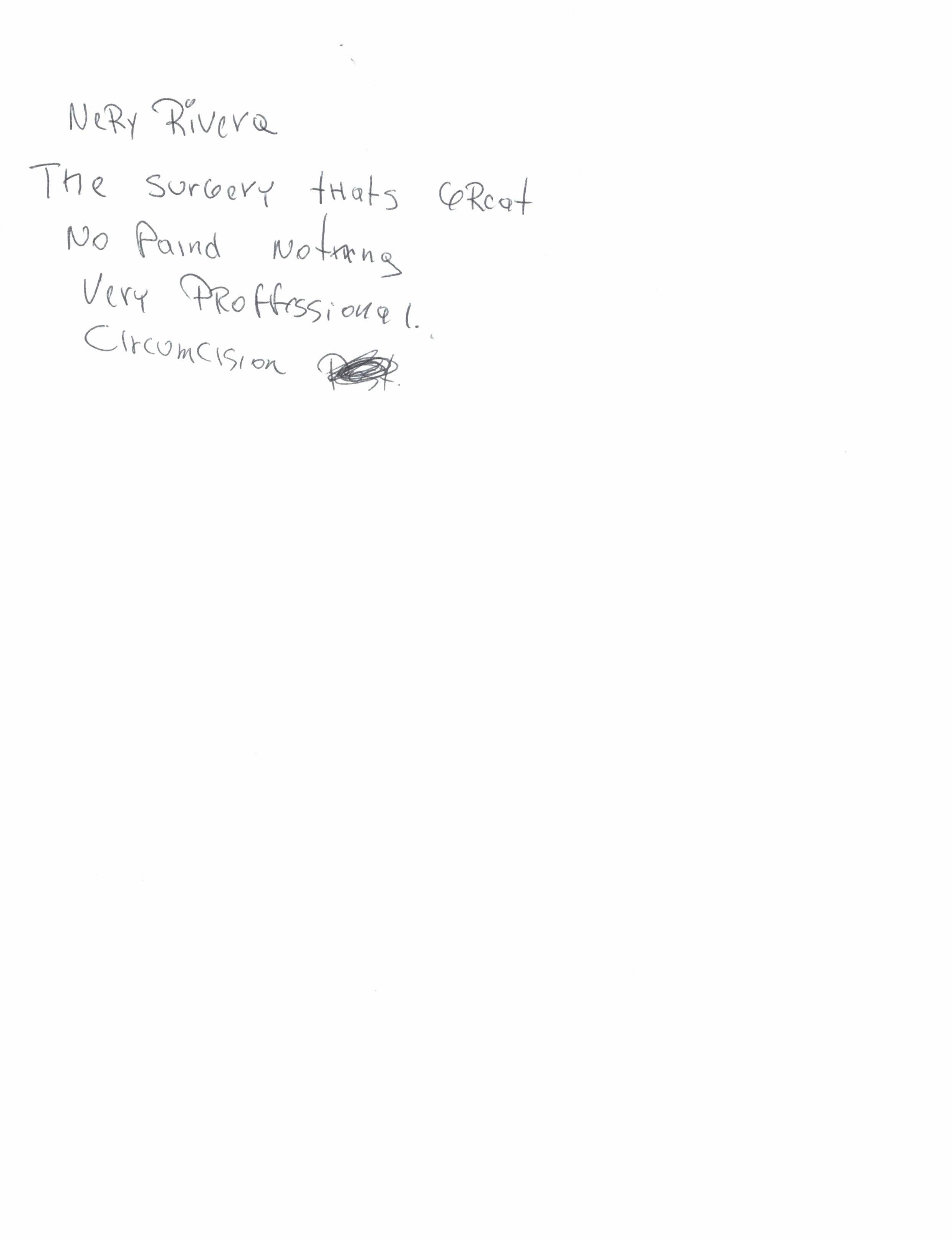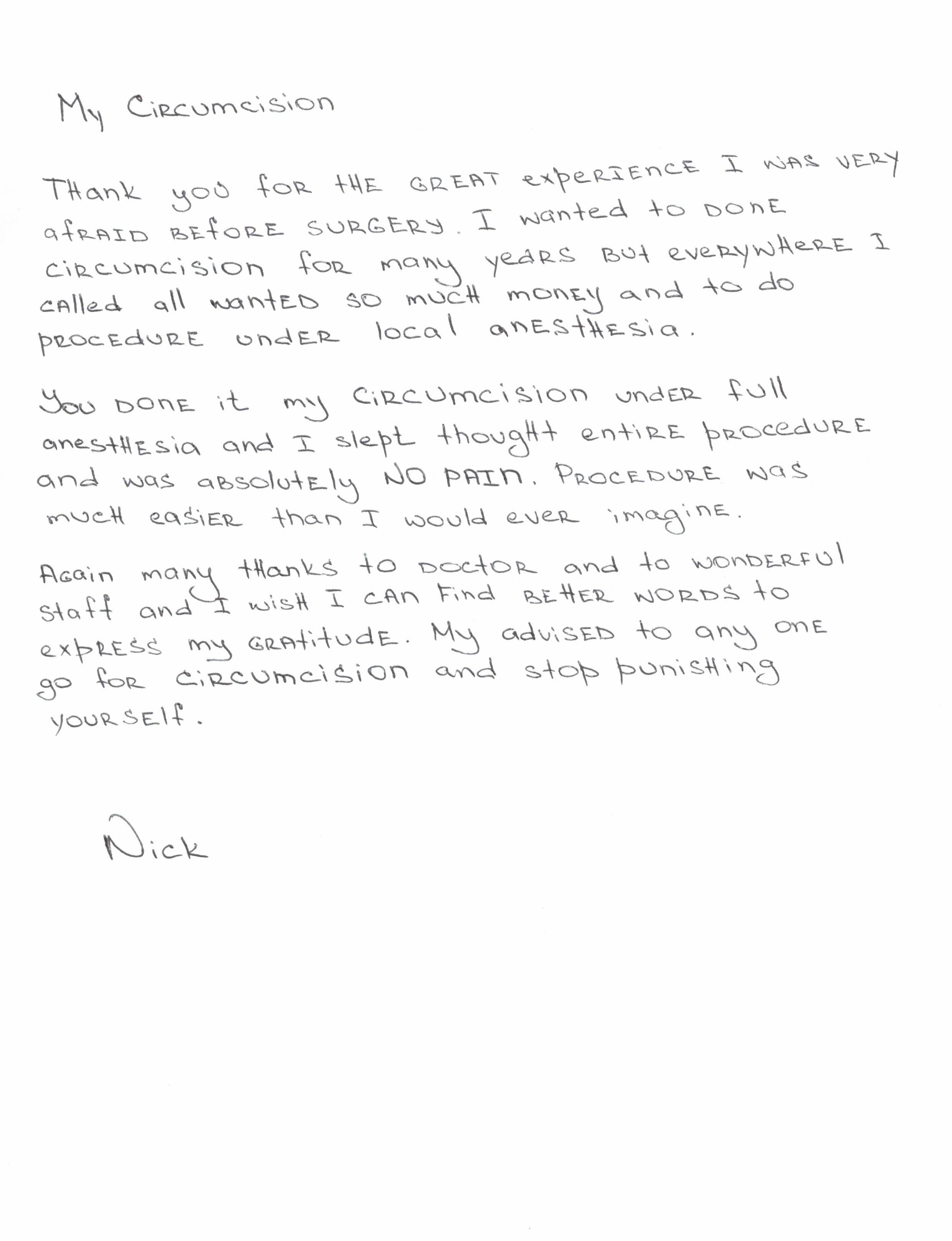 Thank you for the great experience. I was very afraid before surgery. I wanted to done circumcision for many years but everywhere I called all wanted so much money and to do procedure under local anesthesia.