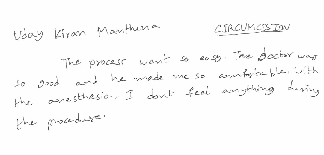 Again many thanks to doctor and to wonderful staff and I wish I can find better words to express my gratitude. My advice to anyone go for circumcision and stop punishing yourself.