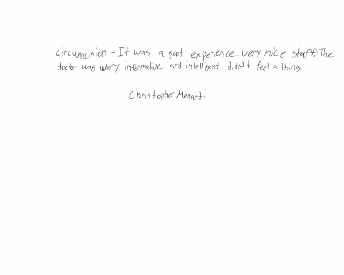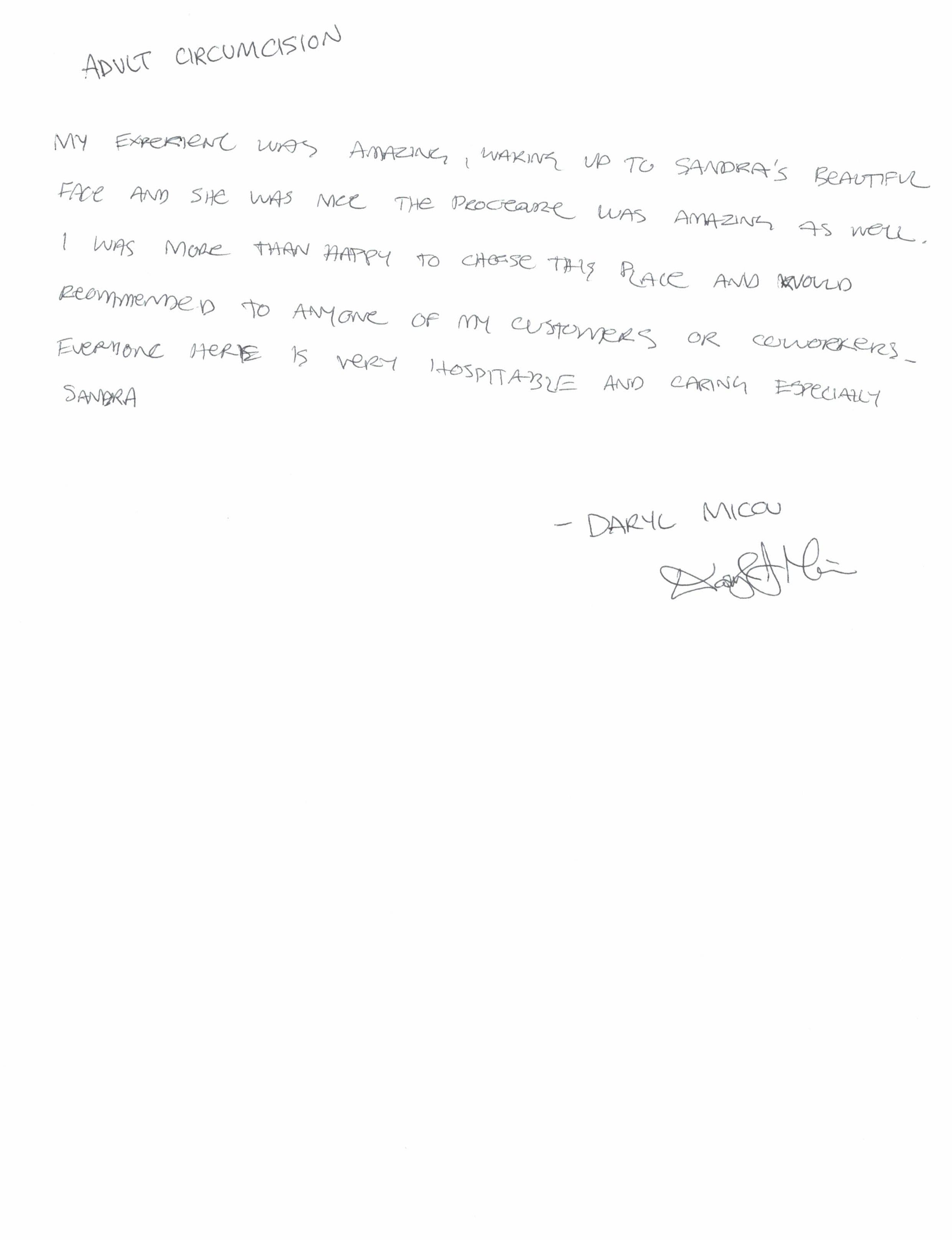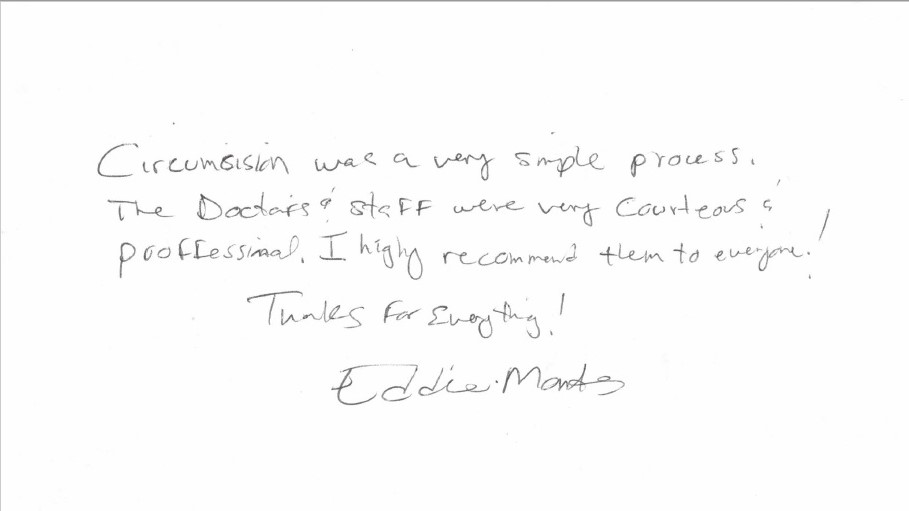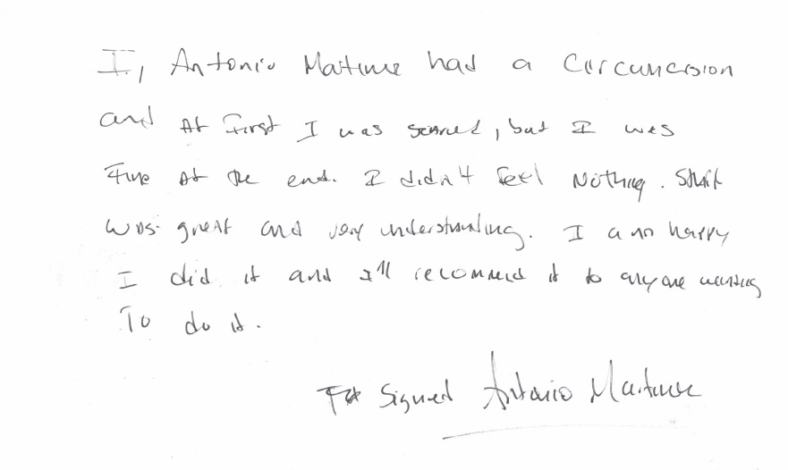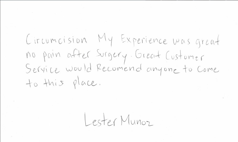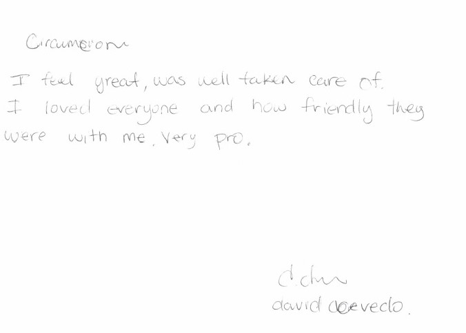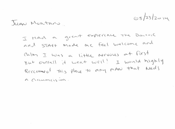 I, Antonio Matune has a circumcision and at first I was scared, but I was fine at the end. I didn’t feel nothing. Staff was great and very understanding. I am happy I did it and I’ll recommend it to anyone wanting to do it.