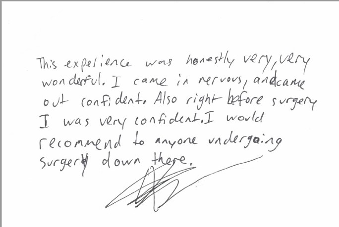 This experience was honestly very, very wonderful. I came in nervous and came out confident. Also right before surgery I was very confident. I would recommend to anyone undergoing surgery down there.