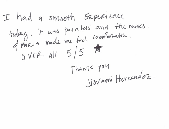 I had a smooth experience today. It was painless and the nurses. Maria made me feel comfortable. Overall 5/5 stars.